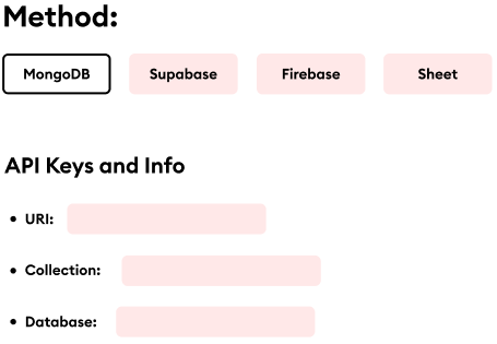 Current DB options are MongoDB, Supabase, Firebase, and Google Sheets.